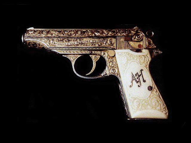 Esta é foi uma das armas pessoais de Adolf Hitler. Trata-se de uma pistola Walther PP com um belíssimo acabamento lavrado e banhado a ouro, empunhadura em marfim com as iniciais AH