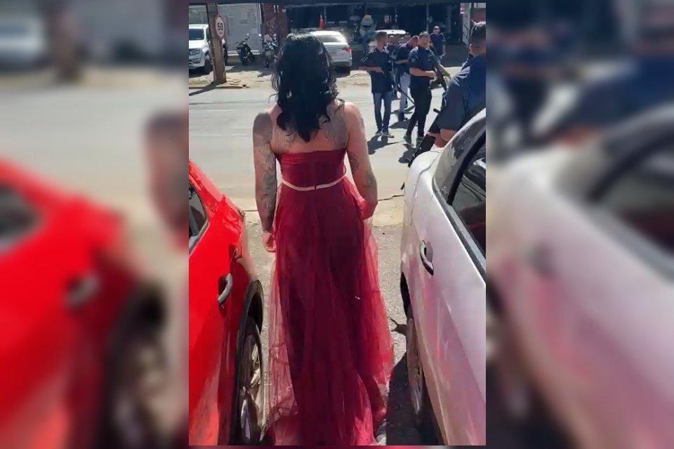Veja o momento em que a “dama de vermelho” atravessa a rua escoltada: