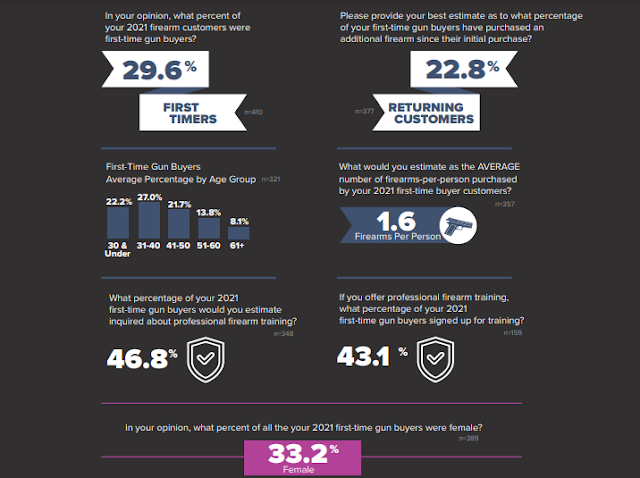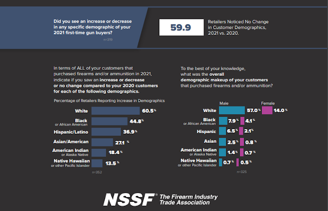 Pesquisas semelhantes de varejistas em 2020 mostraram um aumento de 58% de afro-americanos comprando armas em 2020 em relação a 2019, com um aumento de 49% de hispano-americanos durante o mesmo período e um aumento de 43% de asiático-americanos comprando armas de fogo em 2020 em comparação a 2019. Quase 60% dos varejistas disseram que o aumento desses grupos demográficos de compradores iniciantes que compram armas de fogo permanece inalterado de 2020 a 2021.