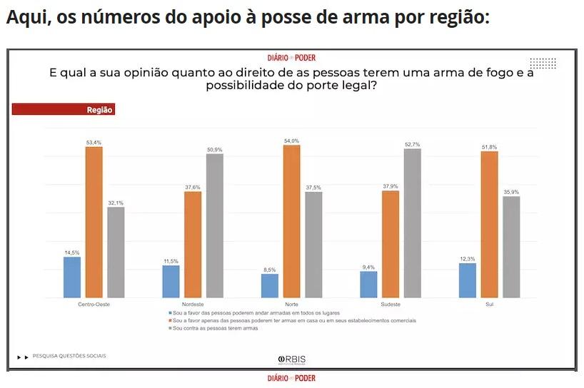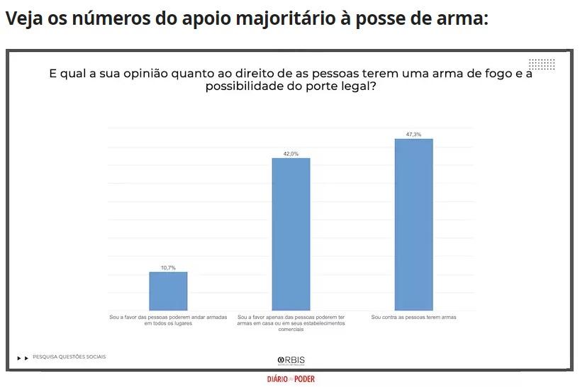 Um levantamento do instituto Orbis para o site de notícias Diário do Poder aponta que a posse e porte de armas de fogo tem o apoio da maioria dos brasileiros, sendo 52,7% a favor. Foram realizadas 2.154 entrevistas por telefone entre os dias 3 e 4 de março deste ano de 2022, em todas as regiões do País.