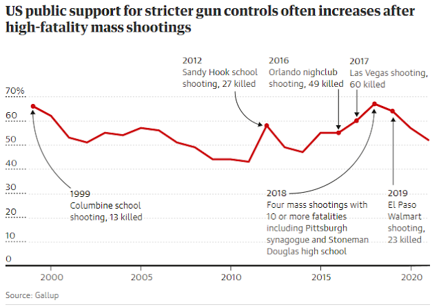 Mas as opiniões são mais variadas quando os americanos são questionados sobre suas opiniões sobre leis de armas mais rígidas em geral. Uma pesquisa de novembro realizada pela Gallup descobriu que 52% dos americanos apoiam um controle de armas mais rigoroso, que marcou a classificação mais baixa na questão desde 2014. O apoio à proibição de armas curtas também atingiu um novo mínimo em 2021, com apenas 19% dos americanos dizendo ao Gallup que seriam a favor de tal política.