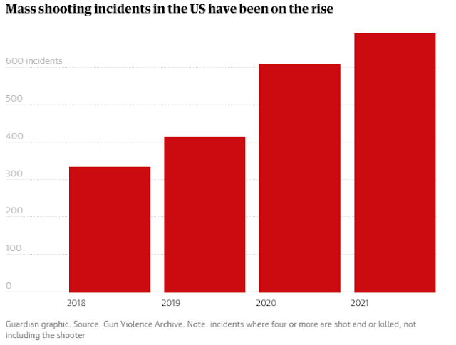 Este ano, 213 tiroteios em massa, definidos como incidentes em que pelo menos quatro pessoas foram baleadas ou mortas, já ocorreram nos Estados Unidos, de acordo com o Gun Violence Archive . Em 2021, foram registrados 692 tiroteios em massa, em comparação com 610 ao longo de 2020.