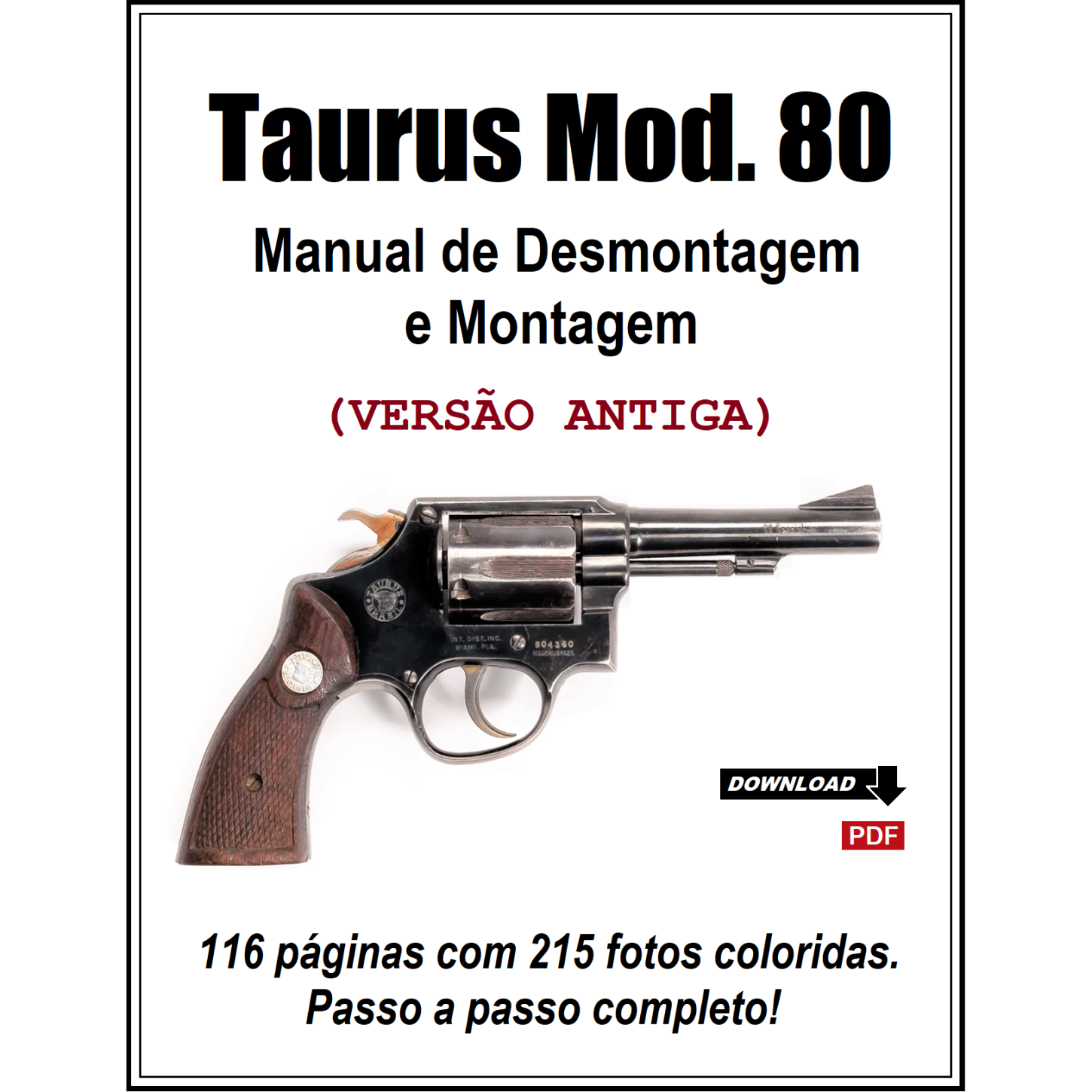 Excelente manual com o passo a passo completo para a desmontagem e montagem do Revólver Taurus modelo 80 e (similares) em sua VERSÃO ANTIGA (canela seca e outros) em calibre Calibre 38 SPL. Special.